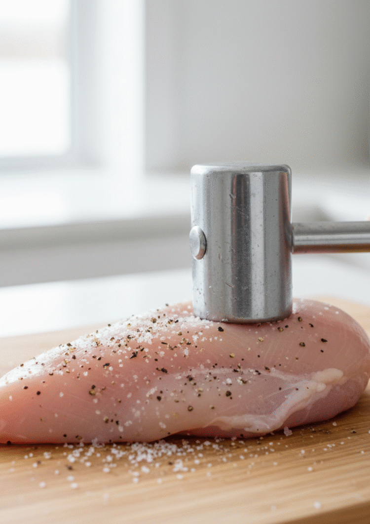 - Prep the chicken: Flatten the chicken breasts a bit if they’re too thick 🥩 then season both sides with salt and pepper 🧂