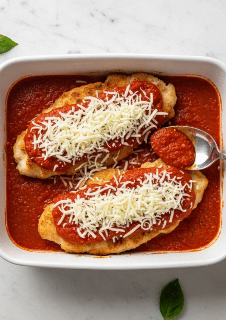 I remember we had just come back from a long family trip and everyone was tired and cranky and I was staring at the fridge thinking what on earth do I make that doesn’t feel boring and then I spotted chicken and some leftover marinara sauce and thought why not give this classic a try and the kitchen turned into a bit of a mess with flour everywhere and eggs dripping on the counter but the smell when it was baking oh wow it was worth every bit of cleanup