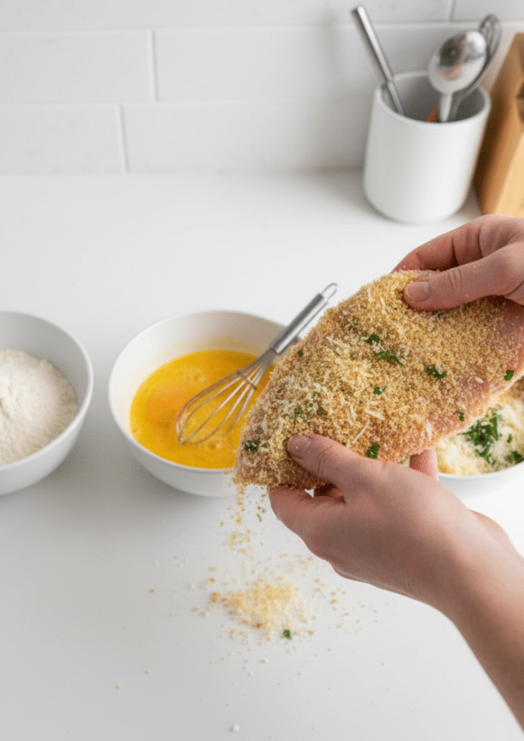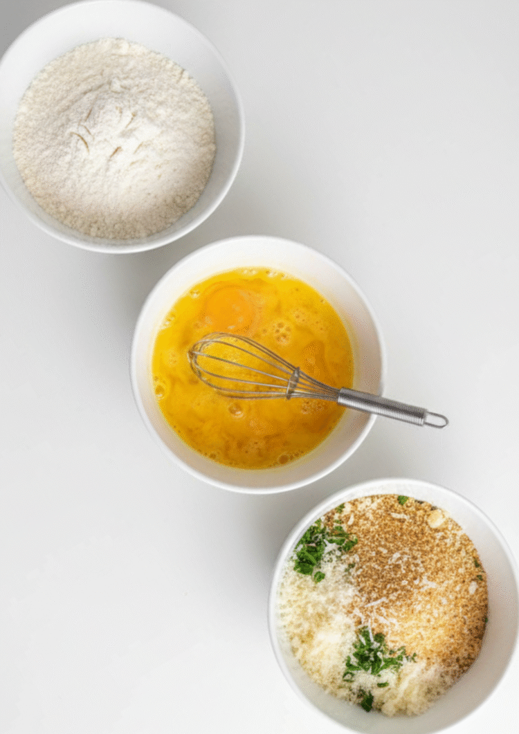 - Set up your coating station: Grab 3 shallow bowls 🥣 — one with flour 🌾 one with beaten eggs 🥚 and one with breadcrumbs 🍞 mixed with Parmesan 🧀 garlic powder 🧄 and Italian seasoning 🌿