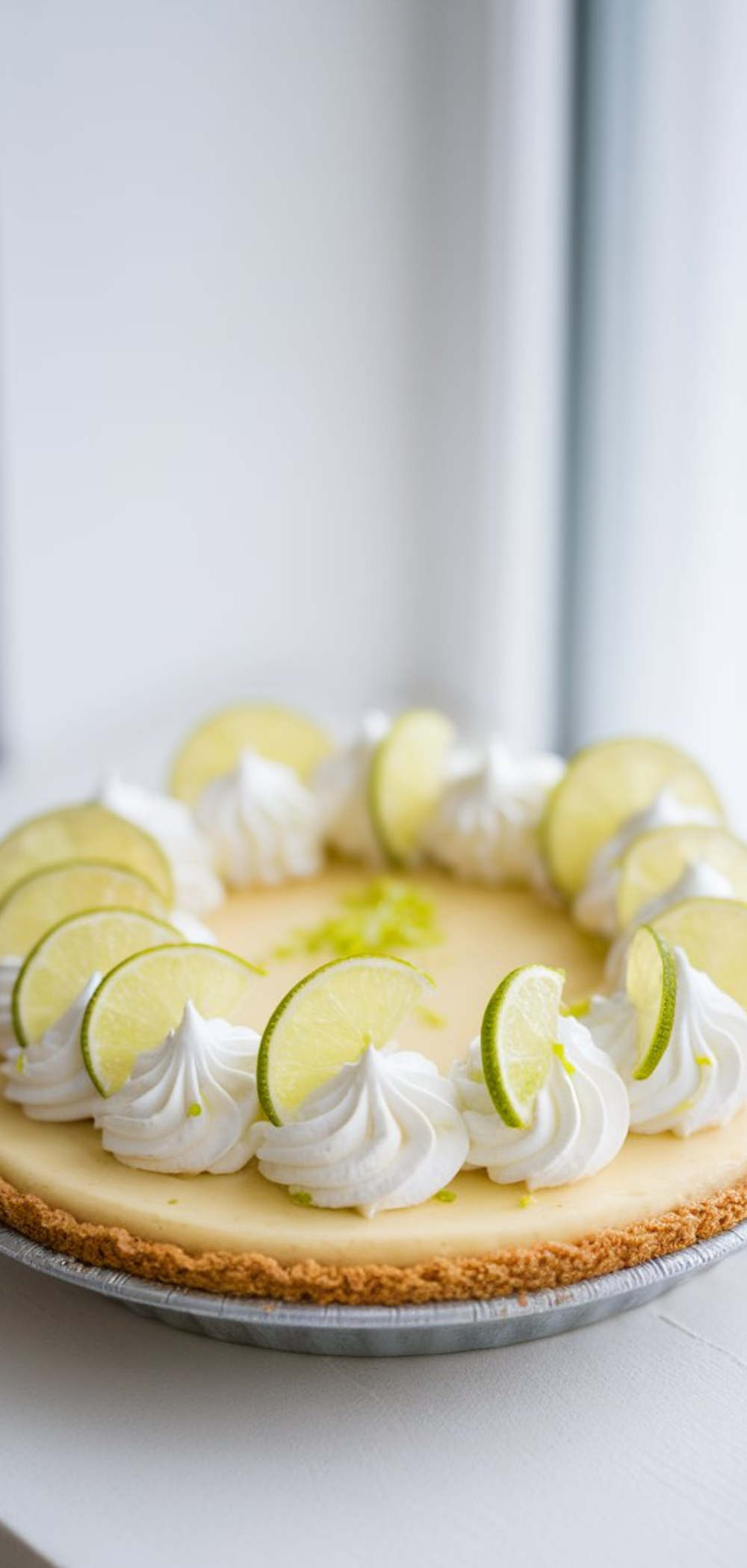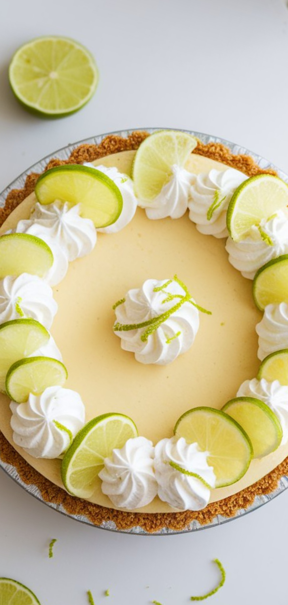 - Just before serving, whip the heavy cream with powdered sugar until soft peaks form. Spread or pipe the whipped cream over the chilled pie, or serve it on the side. Garnish with extra lime zest or thin lime slices if you like.