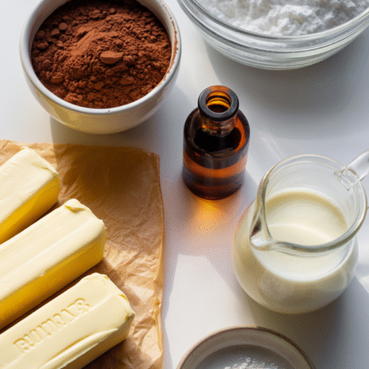 “Ingredients for Midnight Fudge Cake arranged neatly on a white table — cocoa, flour, sugar, and eggs.”